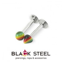 Piercing para labio con poste de acero quirúrgico 316l con pico y bola de acrílico de los colores rastafari, medida 16x8x3.