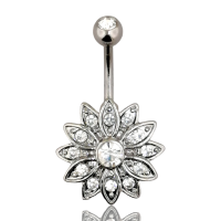 Ombligo figura flor(de rodio) poste de acero quirúrgico 316L con múltiples zirconias de color crystal en calibre 14g(1.6mm).