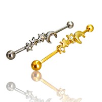 arete para cartilago oreja(industrial) con figura luna con estrellas de acero quirúrgico 316L o anodizado dorado(acero con baño de titanio), calibre 14g(1.6mm) con 38mm de largo y bolas de 5mm