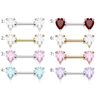 pezonera figura corazón con zirconia de acero quirúrgico 316L y rodio o baño de oro 14K en Calibre 14g(1.6mm), largo de 12mm y corazones de 7mm.