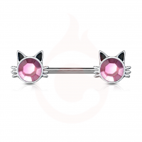 Arete para Pezon de acero quirúrgico con figura de gato con zirconia rosa en calibre 14G(1.6mm).