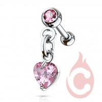 Arete para tragus u oído de acero quirúrgico con colgante de corazón en zirconia color rosa, calibre 16G(1.2mm)